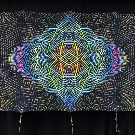Spiritual tapestry, blacklight uv, shamanic tapestry, large wall tapestry, chakra art, techno synthwave, futuristic visionary art