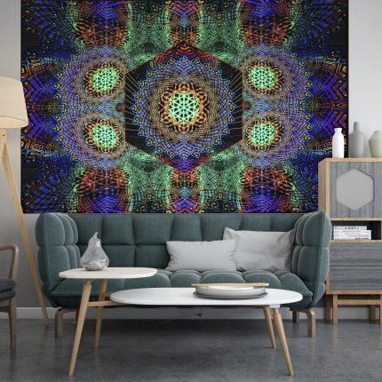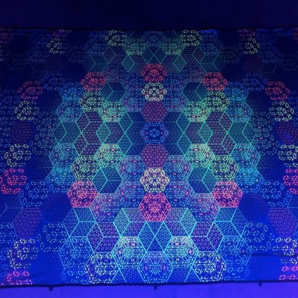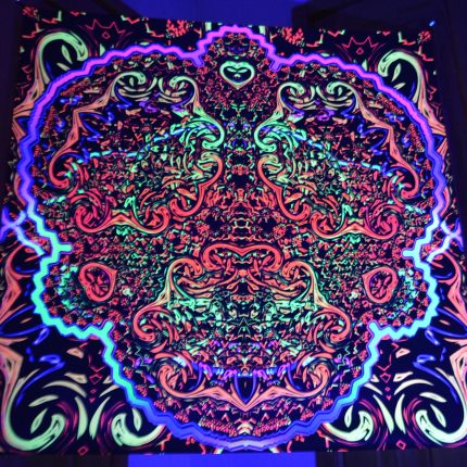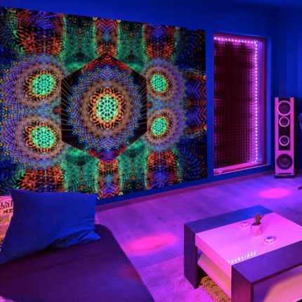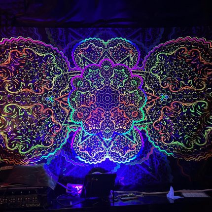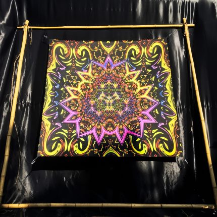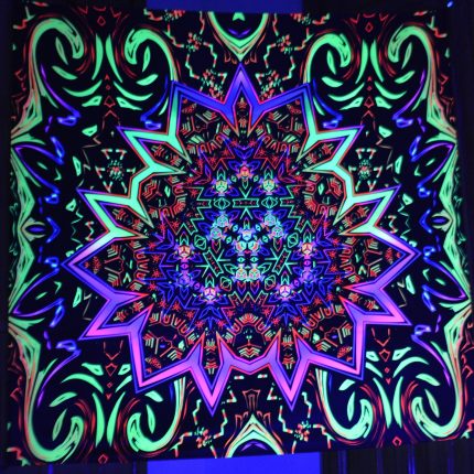 UV reactive backdrop tapestry, psychedelic poster, sacred geometry, meditation room, visionary art, neon light psytrance party