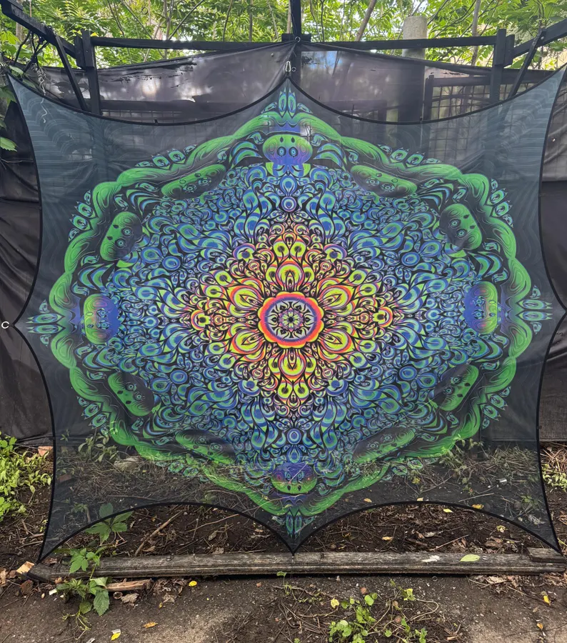 3D Fractal Mandala Tapestry, Psychedelic Blacklight Glow Mesh, UV Reactive Wall Decor (1 Layer)