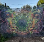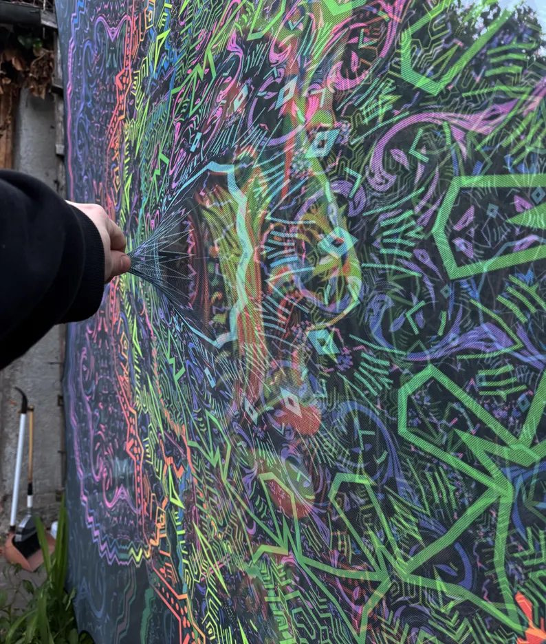 Glow in the Dark Fractal Faces Portal Mesh Tapestry, Neon 3D Psychedelic Art, Blacklight Decor
