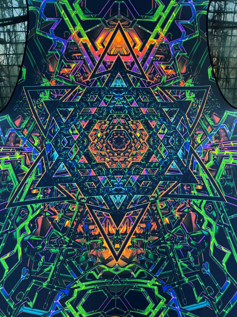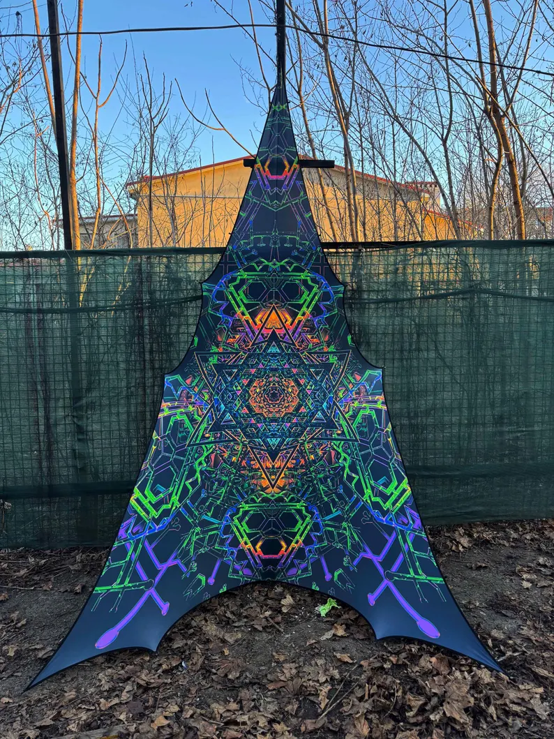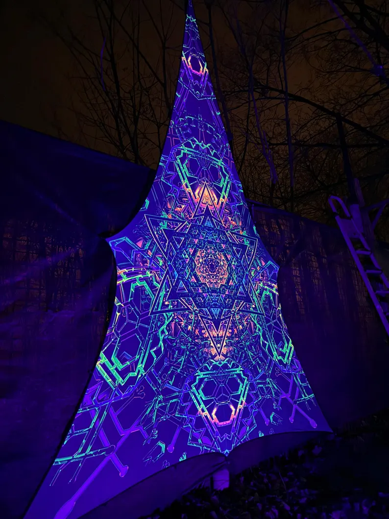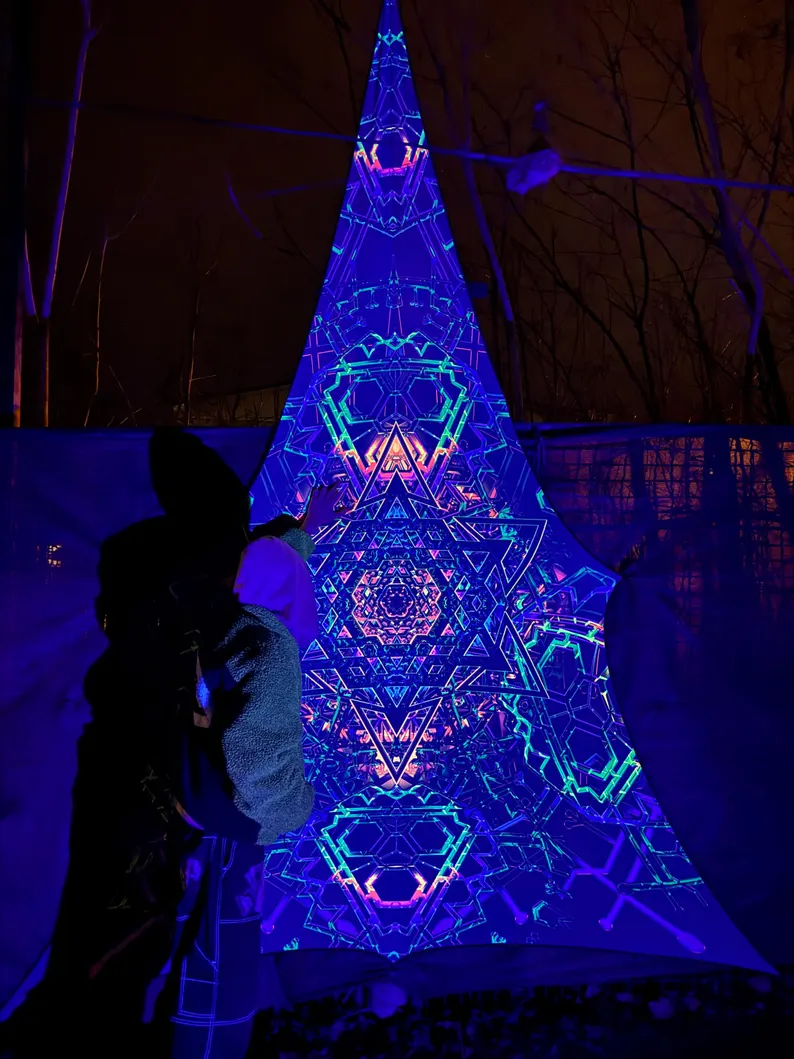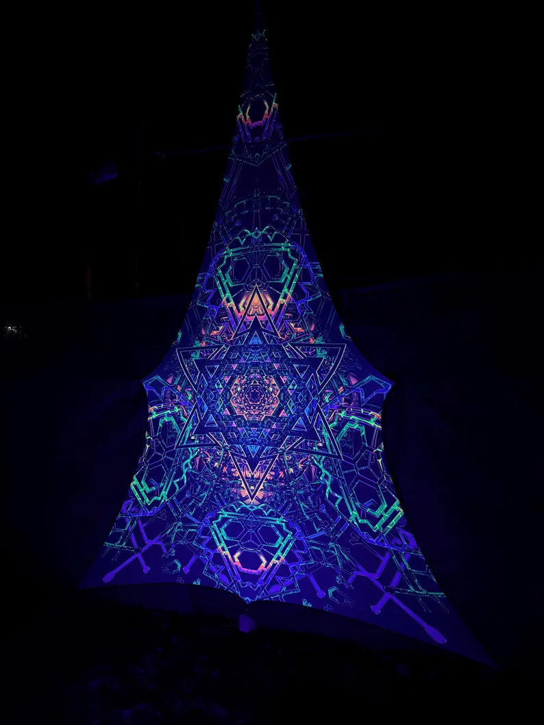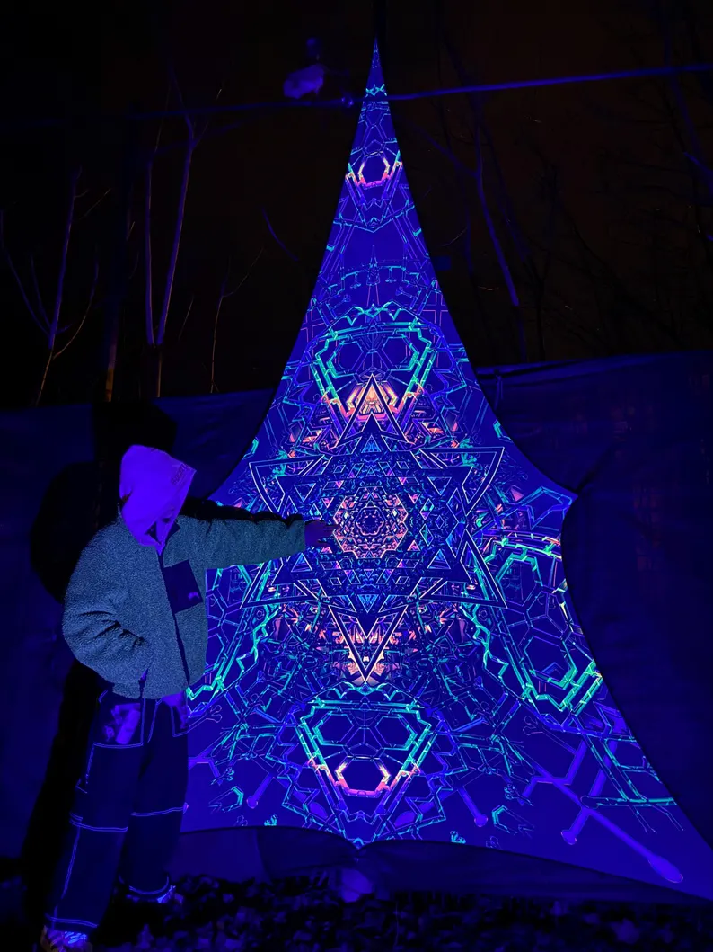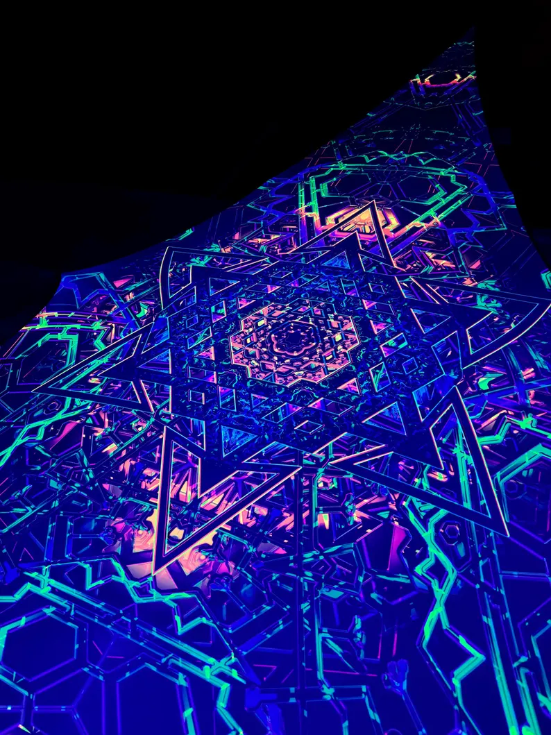 We specialize in rave accessories, uv psychedelic art, uv reactive triangle, large tapestries, Blacklight Tapestry, baldachin goa deco, fluorescent tapestry, psychedelic tapestry, aesthetic tapestry, Festival Canopy, trippy ceiling decor, abstract wall decor, sacred geometry, party decorations, glow in the dark, blacklight canopy, neon sign art, DJ stage, DJ booth, psychedelic canopy, blacklight art, spiritual gifts, UV Tapestry, uv trippy geometric floral baldachin, etc.
