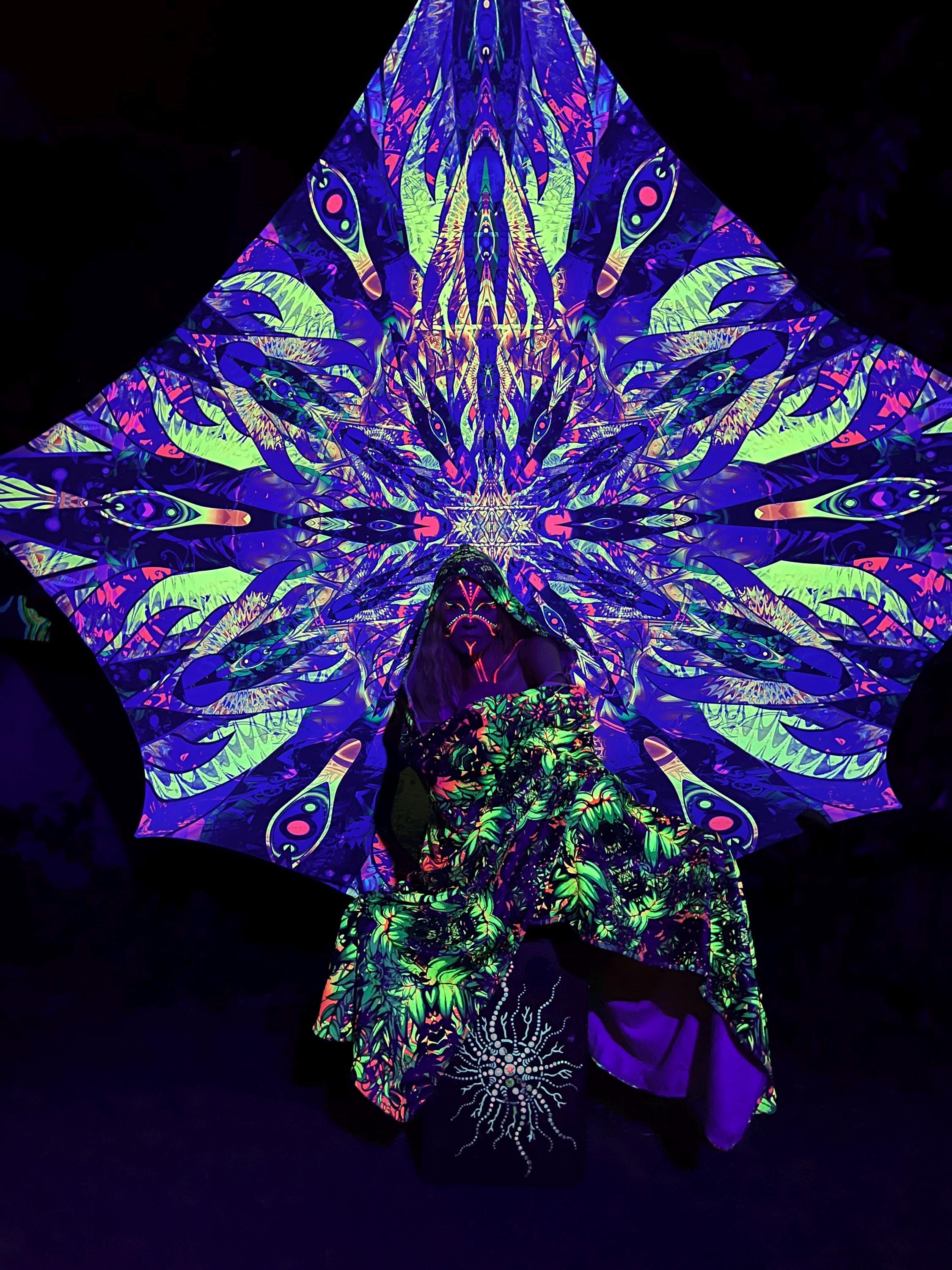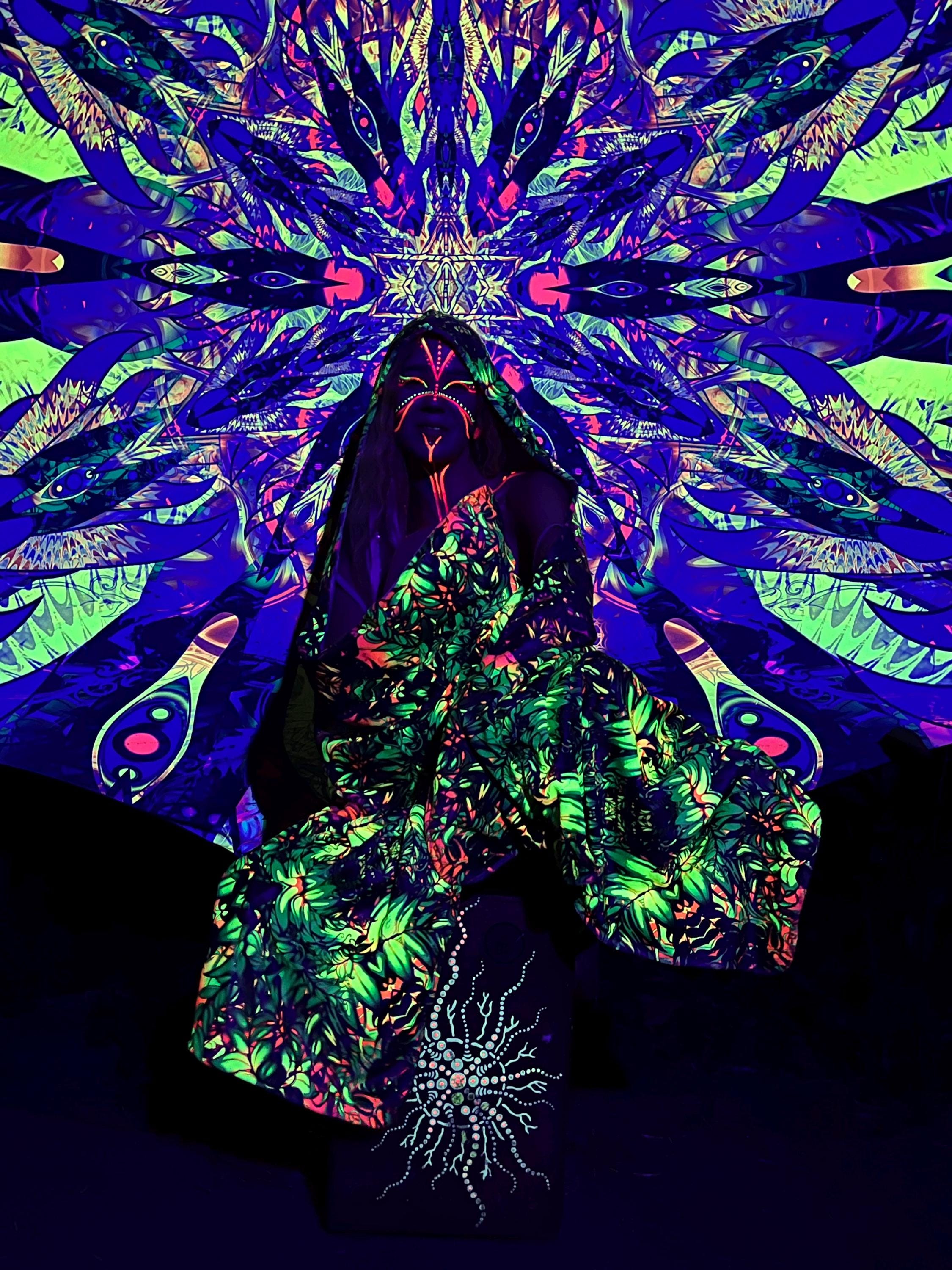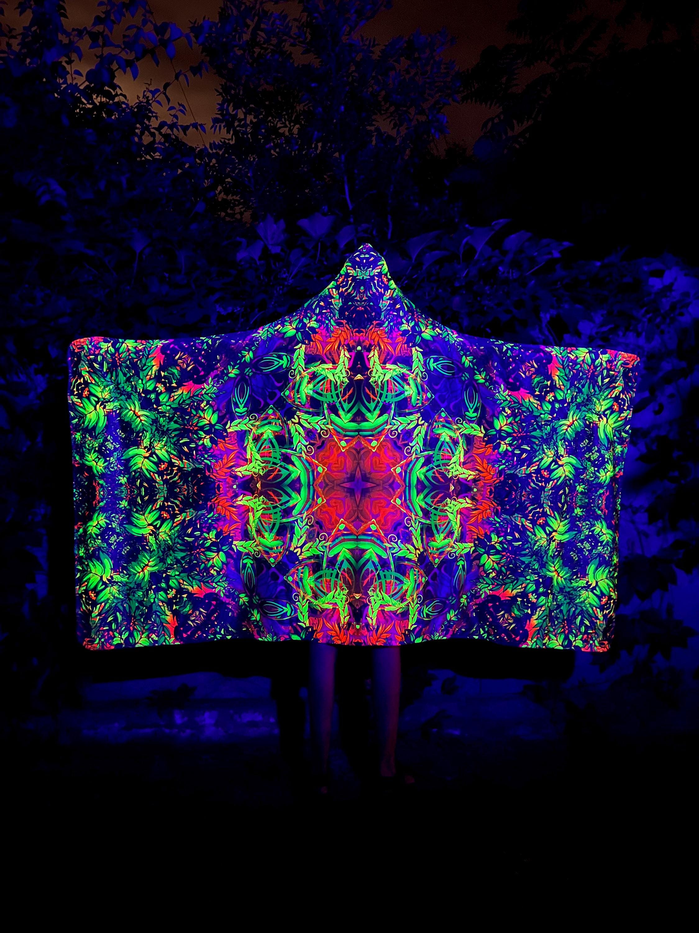 magical hoodie blankets with incredible designs that glow under ultraviolet light. This is a great gift, an original at any festival, perfect for photo shoots, relaxing on the beach or watching sunset or sunrise at an open air.
