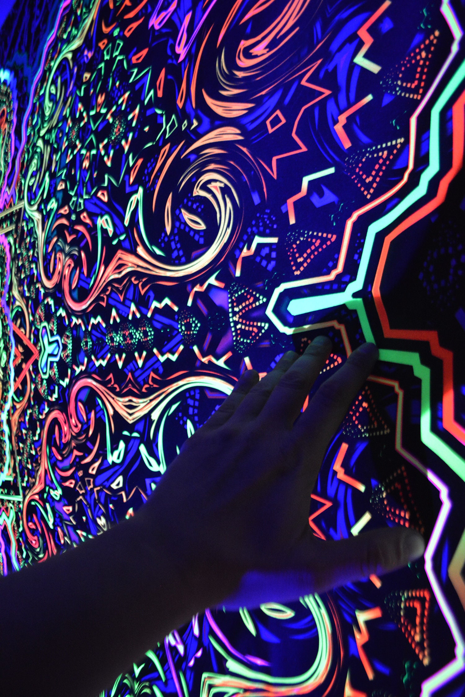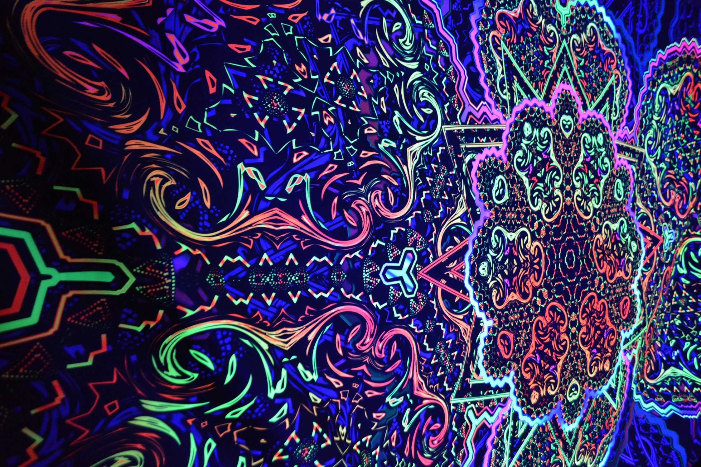 Neon Art Print – Psychedelic Backdrop Black light trippy tapestry glow uv party decor wall hanging fractal art meditation